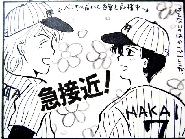 【む】ねえ、私たちどうしてさっきからSMAPなの。同じくらい遠くにいるのに森くんはしっかり見ていて、耕陽ちゃん《※前田耕陽》は見てないみたいよ。でも耕陽ちゃんはあんまし活躍できなかった。だって後ろまでボールが行かないし。いくら森くんが帽子を落としてフェンスにぶつかってボールを取っても、もうその時には勝負ついてる。