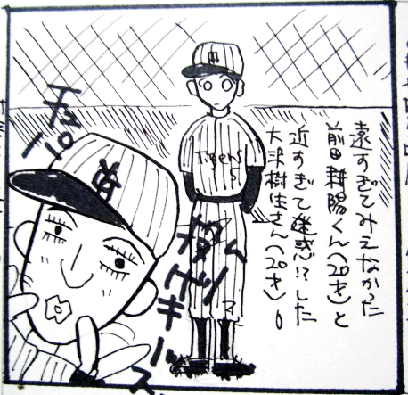【い】昭次ときたら四番打者のくせに全然打てないし…。あれは人気だけでポジションと打順を確保したとしか思えないわ《※お茶の間の知名度は岡健や前田のほうが上でしたが、ファンの間では昭次が圧倒的人気でした》。で、結局途中でライトに飛ばされてしまって、そのせいで私達の森くん《※森且行》が引っ込められちゃって…ひどい!森くんは全然ボールが飛んでこなくても「よぉし来い、パンパン!」って構えてて可愛かったのに…!